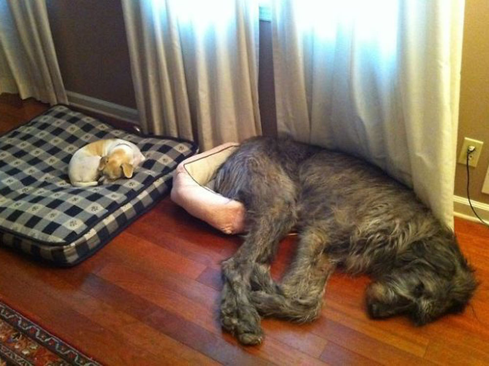 Eso es lo que parece querer decir este lobero irlandés con su cara. Aunque según los veterinarios la necesidad de sentirse protegidos puede llevar a los canes a preferir las camas pequeñas, no creemos que este lobero irlandés esté muy cómodo durmiendo así.