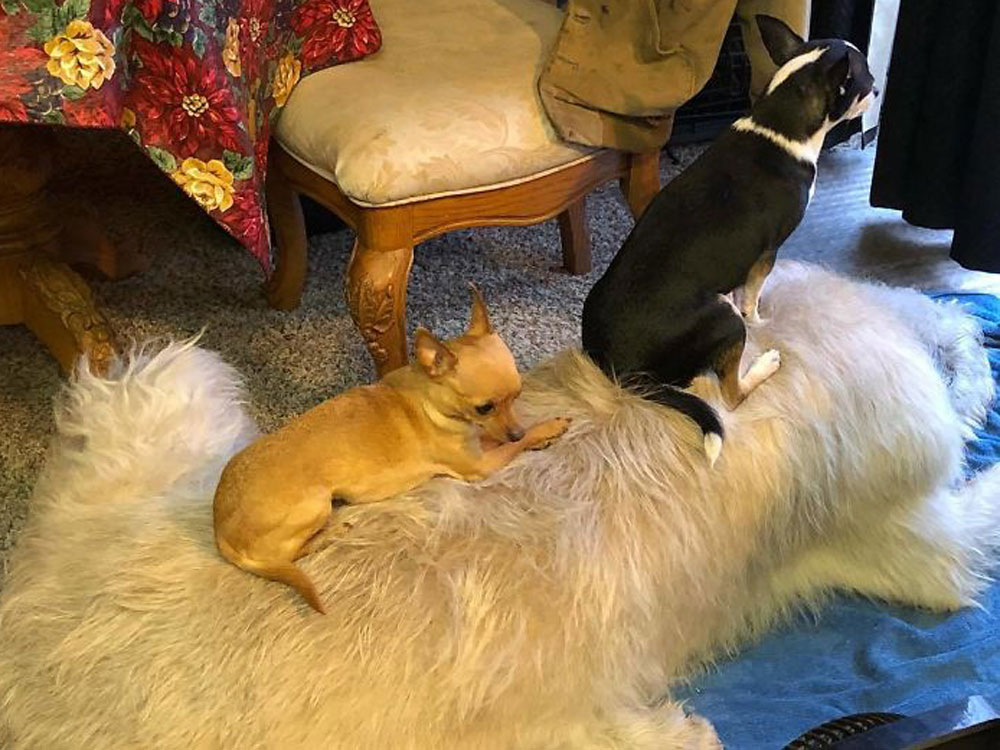 Es increíble lo grande que es este perro, ¡y lo bien que les viene a sus compis de casa! Ya tienen donde sentarse a ver la tele.