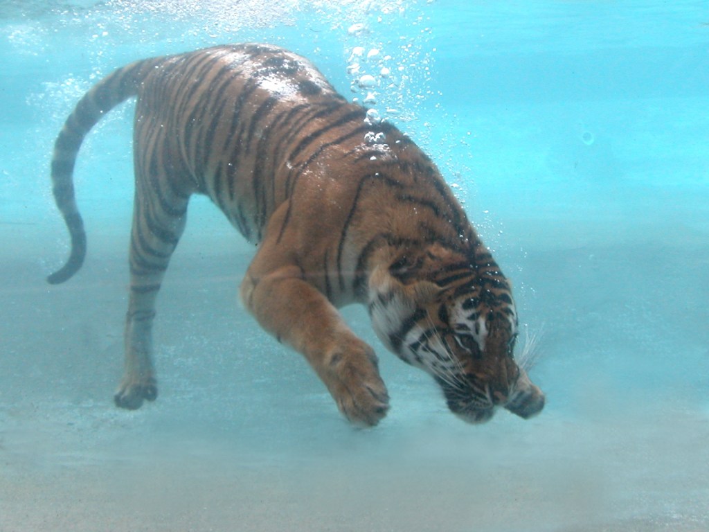 La imagen popular nos invita a pensar que los gatos sienten cierta aversión al agua, y casi es inevitable no extenderlo al resto de animales de la familia. Pero lo cierto es que el tigre se desenvuelve extremadamente bien en el agua y le gusta su contacto. Es un buen nadador y es incluso común hallarlo cerca de ríos u otras masas de agua donde disfruta de su baño con frecuencia. En muchas ocasiones atraviesan nadando estuarios de más de 5 kilómetros de ancho sin demostrar cansancio.