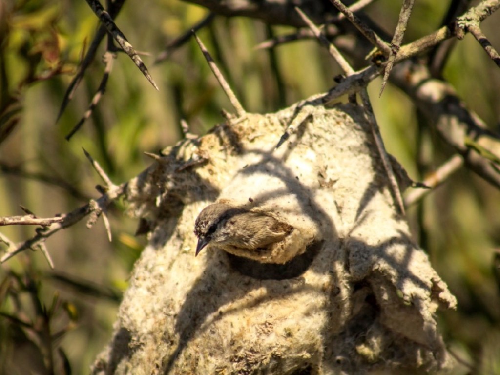 Entre las aves, una de las de mayor nivel de sofisticación a la hora de construir su nido es el pájaro moscón de El Cabo (Anthoscopus minutus). Tejen unos nidos colgantes que fabrican con seda de arañas del género Stegodyphus, con esa característica forma de botijo, y una apertura grande y evidente. Sin embargo, se trata de una entrada falsa.