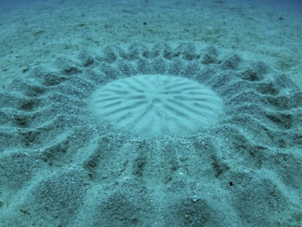 Eso es lo que le sucede al macho del pez sapo de manchas blancas (Torquigener albomaculosus), un animal que se caracteriza por su exuberante exhibición de cortejo. Como si de un jardín de arena zen se tratase, traza complejos patrones circulares de hasta 2 metros de diámetro; una proeza titánica para un solo pez que apenas alcanza los 10 cm de longitud. Pero no solo el patrón es fascinante; gracias a sus movimientos, genera pequeñas corrientes que ordenan los granos de arena según su tamaño; es considerada la estructura más ordenada creada por cualquier pez.