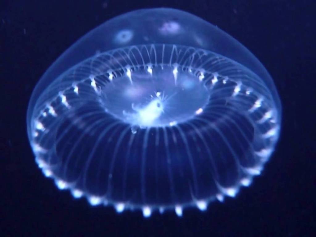 Los peces no son los únicos habitantes del mar capaces de emitir luz. Ciertas especies de medusa tienen una bioluminiscencia muy particular; emiten fogonazos de luz intermitentes que proceden de unas células especializadas localizadas en el endodermo —el tejido interno de la medusa—. Gracias a que su cuerpo es prácticamente transparente, actúa como difusor, y esa luz es visible desde el exterior, destacando los puntos brillantes, y dibujando en la oscuridad el cuerpo entero de la medusa.