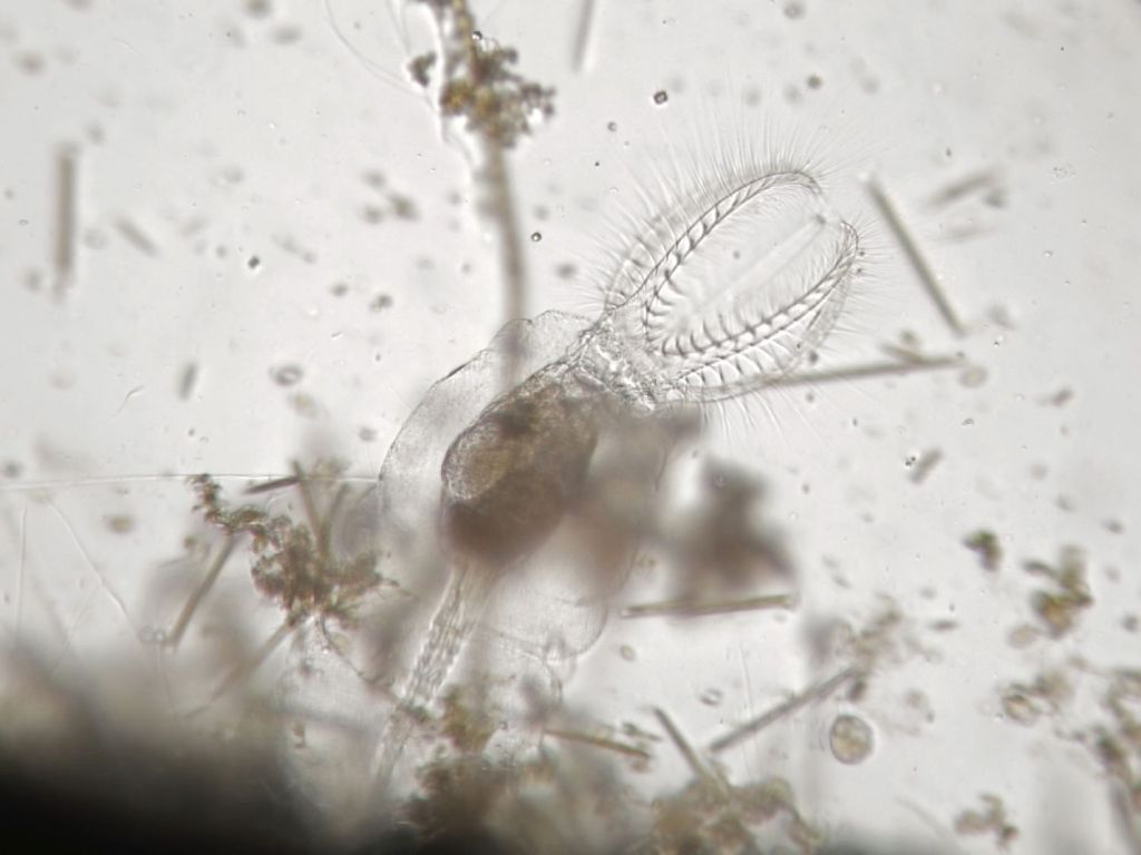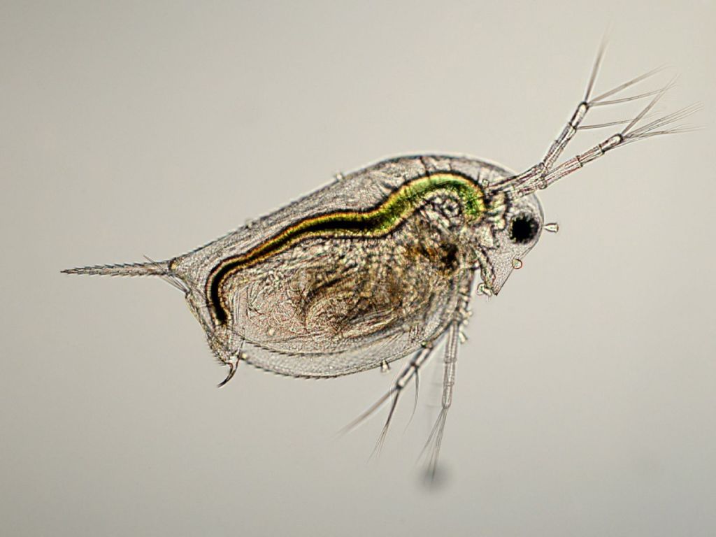 Entre ellas, los cladóceros, como las especies del género Daphnia o pulgas de agua. Son animales muy pequeños, de entre 0,5 y 4 milímetros, que forman parte del zooplancton. Se alimentan de protozoos y bacterias en suspensión, filtrando el agua. Tienen un exoesqueleto translúcido y el cuerpo prácticamente transparente, pero, a pesar de todo, si se presta atención, se pueden ver a simple vista, nadando como a trompicones.