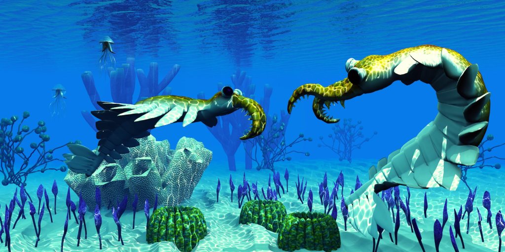 Para encontrar al siguiente superdepredador debemos avanzar hasta hace más de 450 millones de años. En los océanos del Ordovícico, los quelicerados — artrópodos que presentan quelíceros como aparato bucal, como las modernas arañas, escorpiones, ácaros o las cacerolas de las Molucas— evolucionaron hasta adquirir multitud de formas distintas. Y un grupo concreto, los euriptéridos, se convirtieron en el terror de los mares.