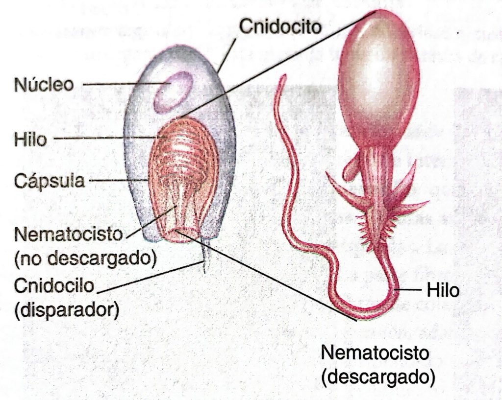 El cnidocito es un tipo celular exclusivo de estos animales; presenta una cápsula llamada nematocisto, compuesta por un largo filamento enrollado y una vesícula cargada a presión. El cnidocito cuenta, además, con un pequeño cilio denominado cnidocio, que actúa como disparador. Cuando el cnidocilo es activado, el nematocisto se contrae repentinamente, dando la vuelta al filamento, como se da la vuelta al dedo de un guante de látex al hincharlo de aire.