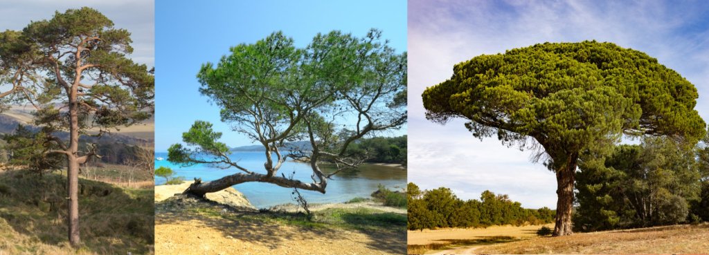 Respecto al porte, el pino adopta una amplia diversidad de formas y aspectos. Los individuos jóvenes mantienen ese aspecto más o menos cónico, pero ya de adultos, la silueta depende de cada especie, y en ocasiones, de cómo se desarrolle.