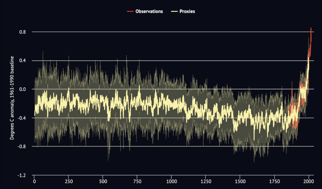 Además, la unión de datos obtenidos a partir de distintas aproximaciones genera conclusiones mucho más robustas, que permiten reducir esos rangos de error. Gracias, por tanto, a la conjunción de todos los datos globales obtenidos en esos miles de estudios, recopilados y centralizados en un solo mapa, es posible desarrollar gráficas con una precisión más que aceptable. Esto nos permite comprobar que en las últimas décadas de la historia hemos superado la temperatura global por encima de cualquier otro momento en los últimos dos mil años.