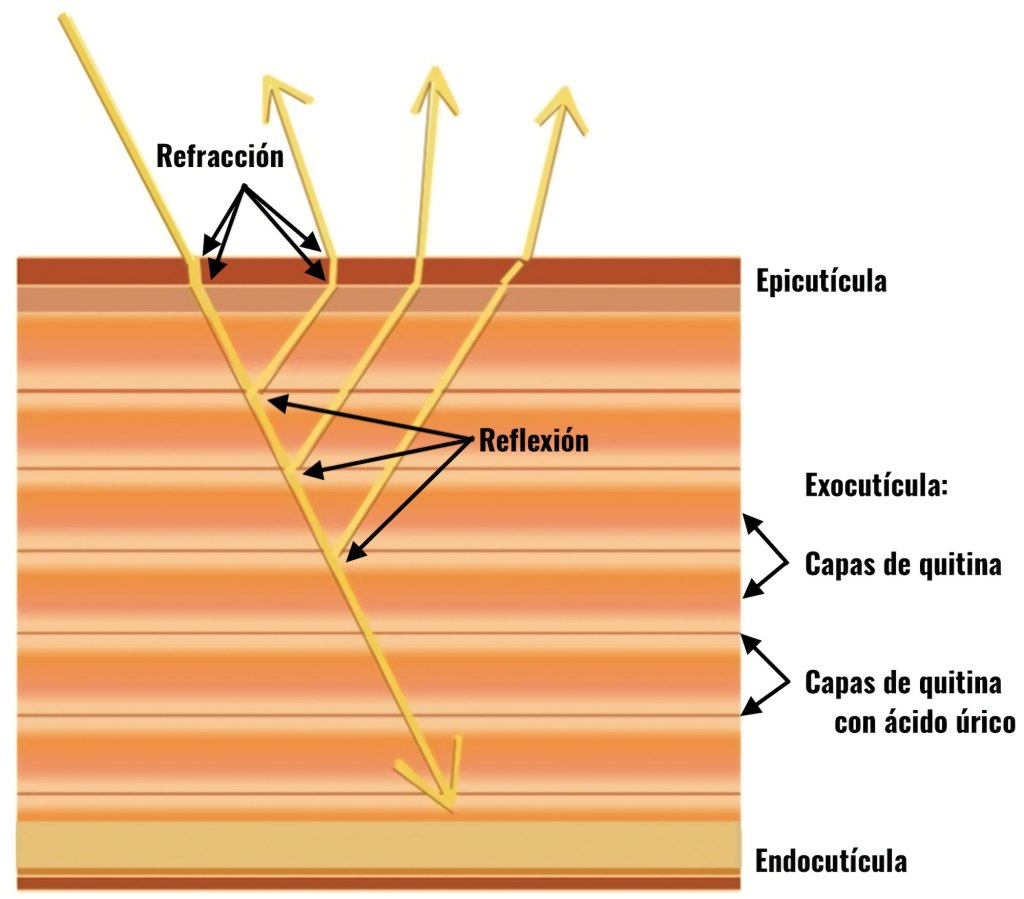 Dependiendo de la composición microcristalina de las capas alternas de quitina con ácido úrico, ciertas longitudes de onda quedan atrapadas en el interior de la cutícula, sin poder salir. En los escarabajos dorados, las longitudes de onda azules y verdes quedan atrapadas, liberándose repentinamente las amarillas y subsiguientes, como se muestra en la gráfica de reflexión. Un espectro similar al del oro. En otros casos se retienen también las longitudes de onda amarillas, dando brillos más cobrizos o, al contrario, se retienen los naranjas y rojos y dejan pasar el resto, que dan lugar a brillos verdes.