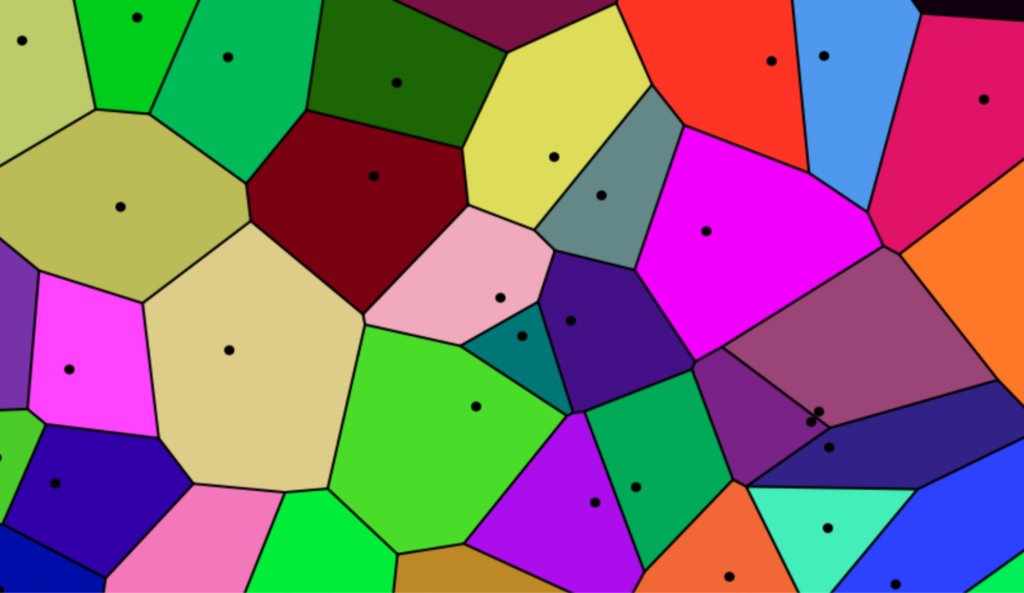 Un diagrama de Voronoi es, para un conjunto de puntos en un plano, la forma de dividir el plano en regiones cuyos límites están conformados por líneas equidistantes a los puntos más cercanos. Dicho de otro modo, en un diagrama de Voronoi se divide el área en tantas regiones como puntos haya, de tal manera que cada región esté conformada por todo lo que esté más cerca del punto que contiene que de cualquier otro punto. Se entiende mucho mejor con una imagen.