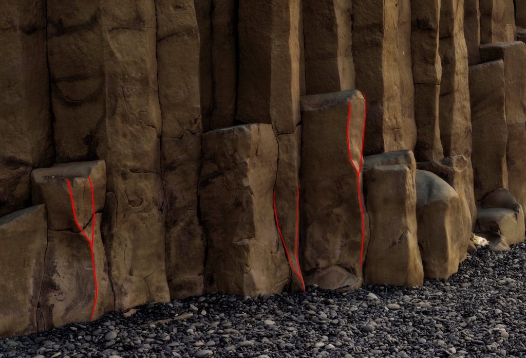Es posible identificar escutoides en estructuras geológicas. Una de las formaciones más características son las denominadas columnas basálticas; tienen el aspecto de pilares, más o menos verticales, con un aspecto de prismas poligonales. Sin embargo, entre esos prismas, especialmente si son demasiado altos, no es raro que aparezca algún escutoide. Son complicados de ver en la superficie —ya que solo se ve la base de la estructura—, pero al observarlos de lado, las aristas características en forma de ‘Y’ se hacen patentes, sobre todo si la formación original tenía la superficie superior algo curvada.