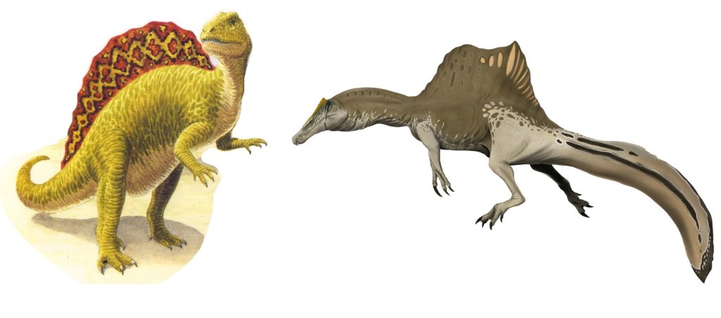Pero incluso este sistema, combinando los dos métodos, puede tener errores. Y regresamos al extraño caso de Spinosaurus. Desde su descubrimiento y hasta principios del siglo XXI, se asumió que esta criatura era bípeda. Para su reconstrucción se utilizó, inicialmente, un terópodo genérico, y desde 1987, se utilizó como modelo a Baryonyx, un pariente cercano de Spinosaurus, descubierto ese mismo año. Su reconstrucción, a partir de restos parciales, se basaba en el escalado de este pariente, asumiendo que era un gran dinosaurio bípedo, con patas traseras largas, y una cola que hacía de contrapeso, con la característica vela en la espalda.