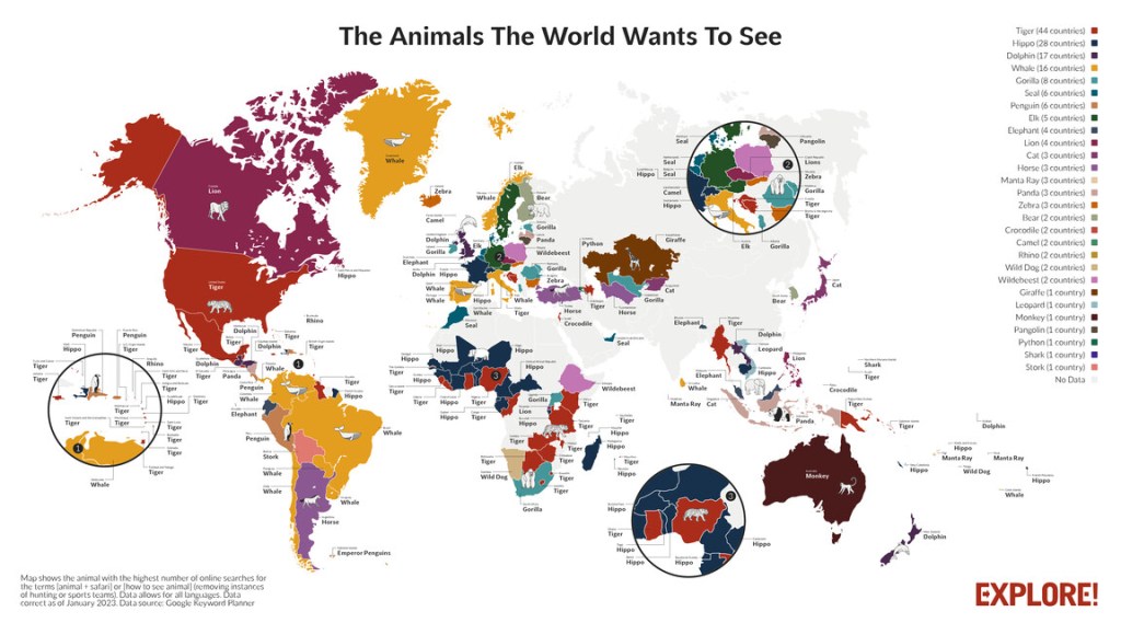 El informe destaca una amplia gama de vida silvestre en todo el mundo, con hipopótamos, focas y alces, situados entre los diez primeros. Como curiosidad, el nuevo mapa muestra que en lugares como Corea del Sur su animal favorito es el oso, mientras que en Islandia su inclinación es hacia las cebras. En el otro extremo, los animales menos populares incluyeron la pitón, el tiburón y la cigüeña, que obtuvieron un voto cada uno.