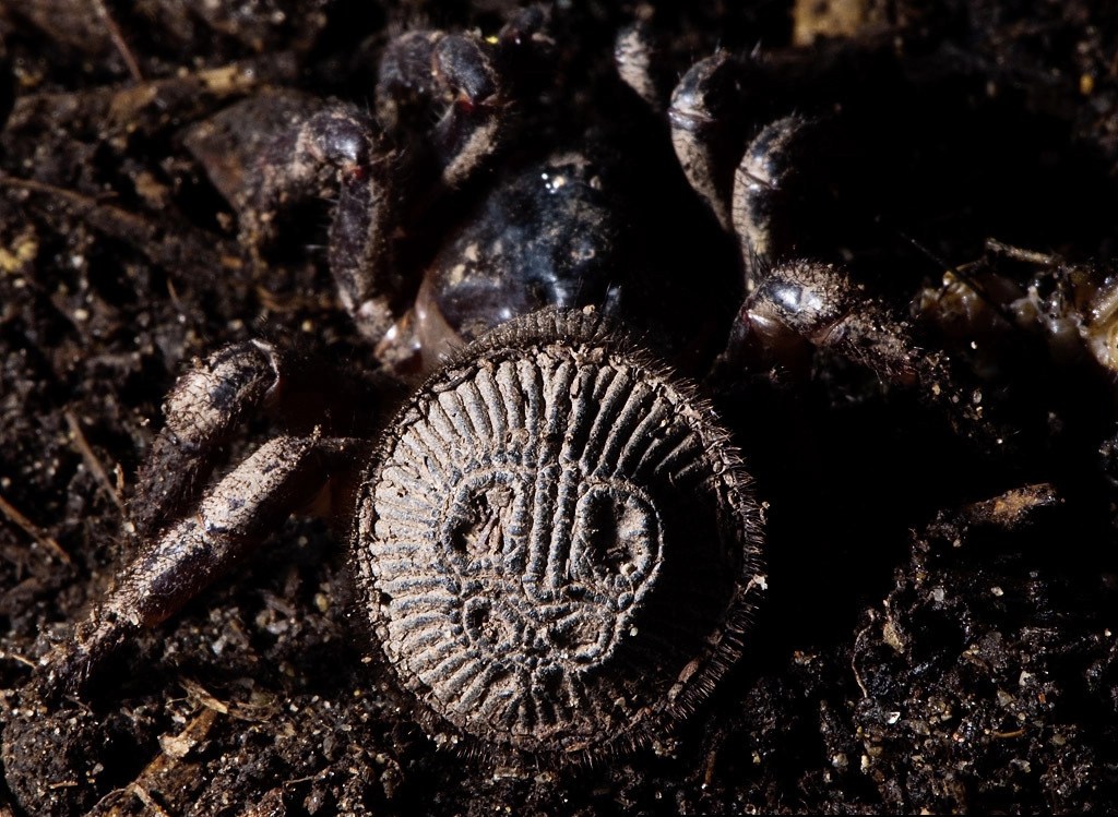 En el disco opistosomal de una ‘araña moneda’ hay varios detalles. En la parte externa del disco, destaca una serie de hendiduras en sentido radial, creando un margen tenuemente lobulado. En el centro, tres pares de estructuras ovoides, dispuestas simétricamente, recorren el área de arriba abajo, en tamaño decreciente —las superiores son las más grandes—, y entre ellas, una serie de nódulos redondeados completan el patrón, cuya forma varía entre especies e incluso entre ejemplares.