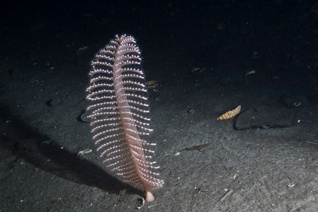 La pluma de mar parece una planta, pero pertenece al reino animal. Aunque tiene el aspecto de un solo organismo, en realidad, es una colonia formada por multitud de pequeños individuos, denominados pólipos. La colonia se asienta sobre un pólipo central de gran tamaño, de hasta 40 centímetros de longitud, sobre el cual nuevos organismos se apilan a ambos lados.