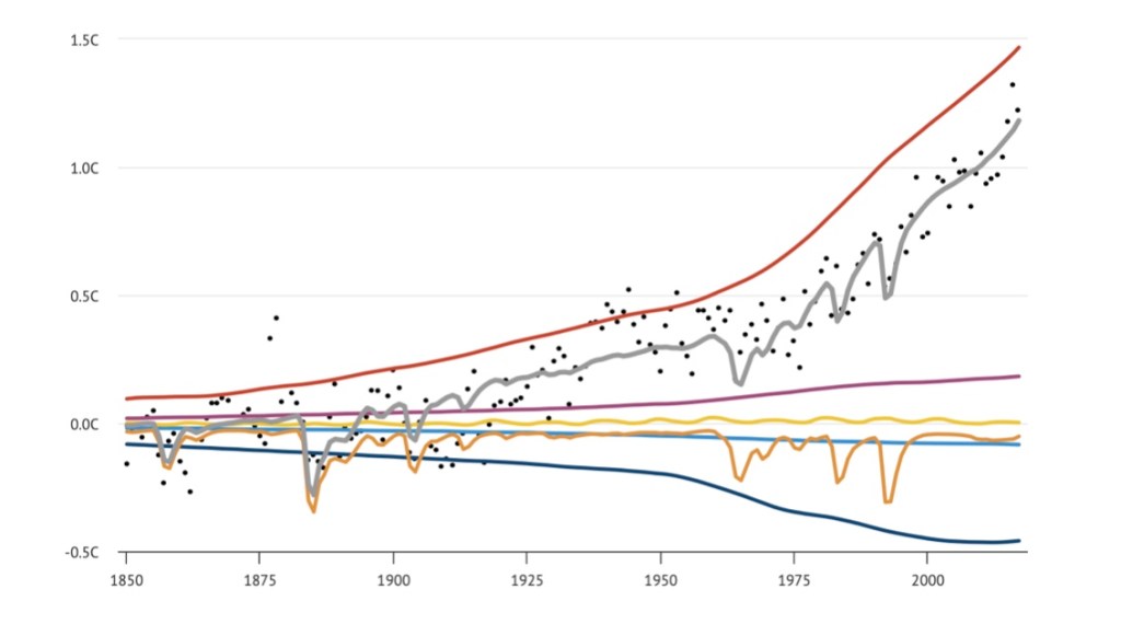 Comprender las razones de este rápido calentamiento no es para nada sencillo. Los estudios basados en modelos climáticos nos permiten estimar la influencia de los aerosoles, las erupciones volcánicas, o de los gases de invernadero, entre otros. Su análisis nos indica que el efecto de todos los factores más o menos se compensa, excepto el que corresponde a los gases de invernadero, tal como muestra en el siguiente gráfico: