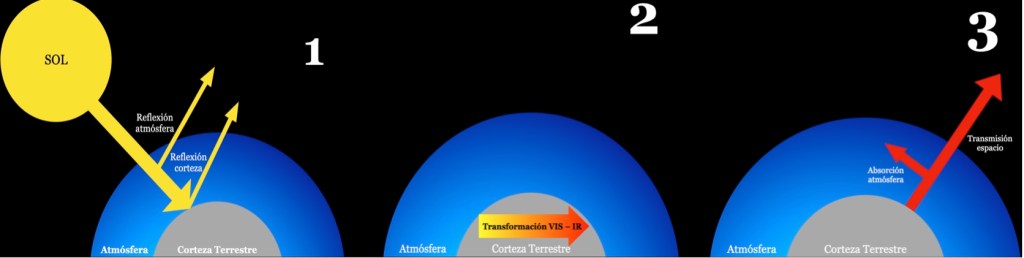 Por tanto, el calentamiento de la atmósfera se produce por la captura de una parte de la radiación infrarroja emitida por la Tierra. El calentamiento no se debe, directamente, la radiación que viene del Sol. La corteza terrestre actúa entonces como una estufa, emitiendo gran cantidad de radiación de baja energía, si la comparamos con la radiación visible, y aún menor si la comparamos con la ultravioleta.
