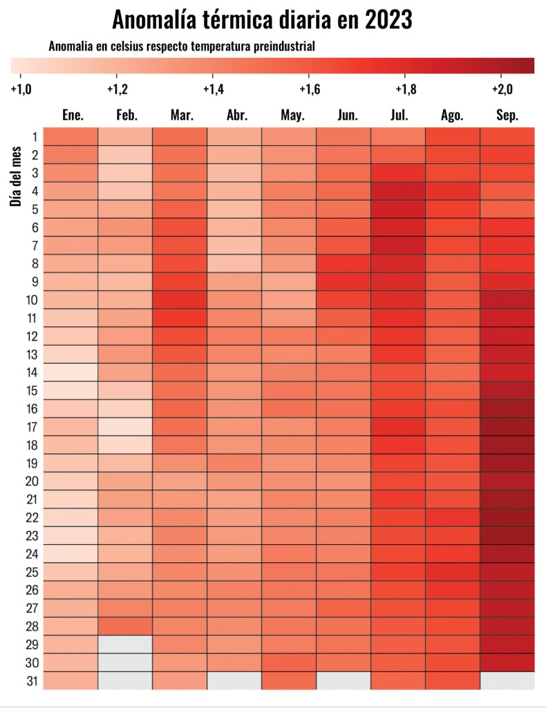 Más específicamente, se calcula que septiembre de 2023 ha superado al récord térmico anterior, que sucedió en 2020, en medio grado. Es, además, la anomalía térmica más alta jamás registrada, superando a la de febrero de 2016, que coincidió con un evento de El Niño.