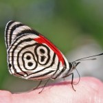La mariposa 88, (Diaethria anna) habita en los bosques húmedos tropicales, desde México hasta el norte de Argentina. Su aspecto dorsal revela un color marrón oscuro, adornado con una banda metálica verde azulado en las alas anteriores. Pero lo más interesante se encuentra en la parte inferior; tras una línea de un vibrante tono rojo, se extiende un intrincado patrón de formas curvas, de color negro en fondo blanco.