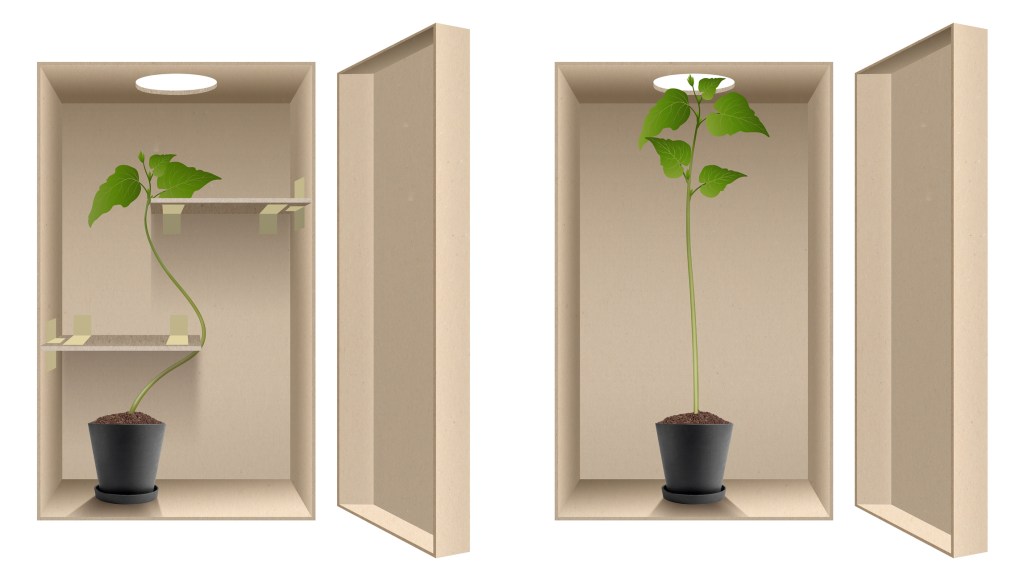 Hay un experimento muy fácil de realizar con niños, que despierta su curiosidad sobre los misteriosos comportamientos de las plantas. Consiste en introducir una plántula recién germinada, por ejemplo, de alubia, en una caja opaca con un agujero que permite la entrada de luz. No importa cómo se coloque la planta en el interior, siempre crecerá hacia el agujero. De hecho, si el experimento se complica con un laberinto en el interior de la caja, y se coloca a la planta en el extremo opuesto al agujero, el tallo resolverá el laberinto, mediante el crecimiento, sin error.