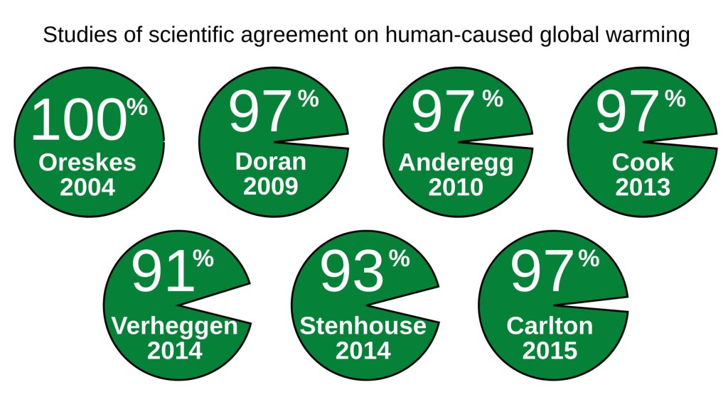 Actualmente, el consenso sobre el cambio climático antropogénico comprende al 97,3 % de la comunidad científica general, y llega casi al 100 % entre los científicos especializados en clima y meteorología. Aún más revelador es, en palabras del investigador John Cook, de la Universidad de Queensland (Australia), y sus colaboradores, que existe un ‘consenso sobre este consenso’. En otras palabras, no solo hay un acuerdo generalizado sobre que el cambio climático es causado por el ser humano, además hay una concordancia abrumadora sobre la solidez y fiabilidad de este consenso. Esta doble capa de acuerdo fortalece aún más la validez del consenso científico como una base sólida de conocimiento.