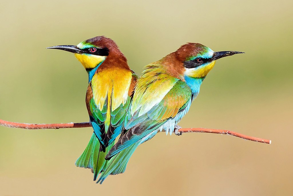 El abejaruco común (Merops apiaster) es una de las aves más vistosas y espectaculares que adornan los cielos de España, por su impresionante paleta de colores y su destreza en el vuelo. Con una longitud de menos de 30 centímetros y una envergadura de apenas medio metro, se distingue por su cuerpo esbelto adornado con tonalidades desde el rojizo, amarillo y verdoso en la partedorsal, hasta el verde y azul en la parte inferior. Posee un pico largo y curvado, ideal para su dieta insectívora y una cola larga que acentúa su elegante silueta.