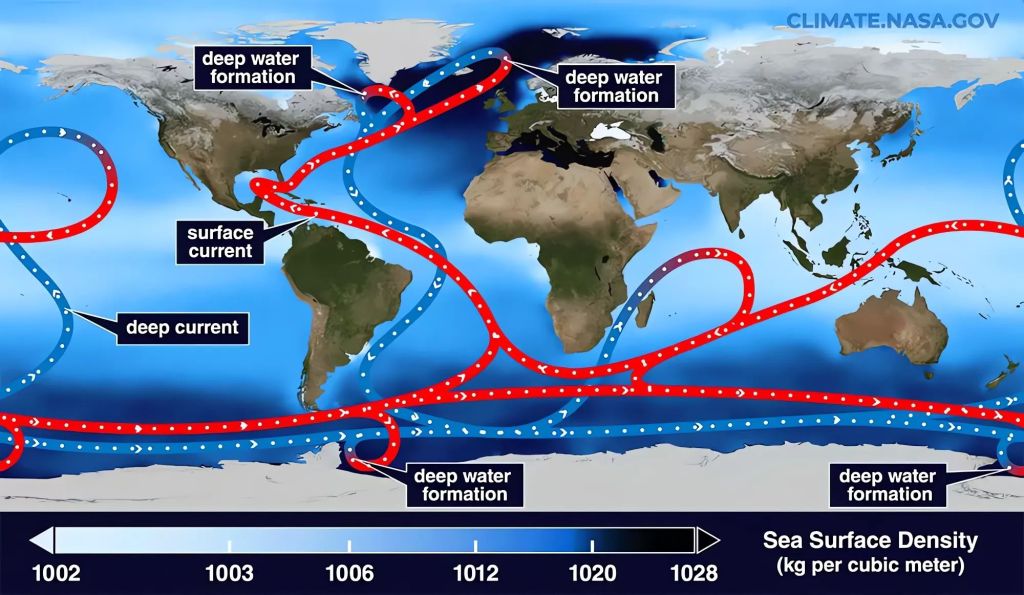 Más allá del Atlántico Norte, las corrientes siguen su redistribución por todo el planeta, cubriendo los océanos Índico y Pacífico, siempre con aguas cálidas en superficie y aguas frías en profundidad. Este sistema global de corrientes resulta crucial para el equilibrio del clima, pues redistribuye el calor a nivel global e influye en los patrones térmicos regionales y la estacionalidad de las precipitaciones.