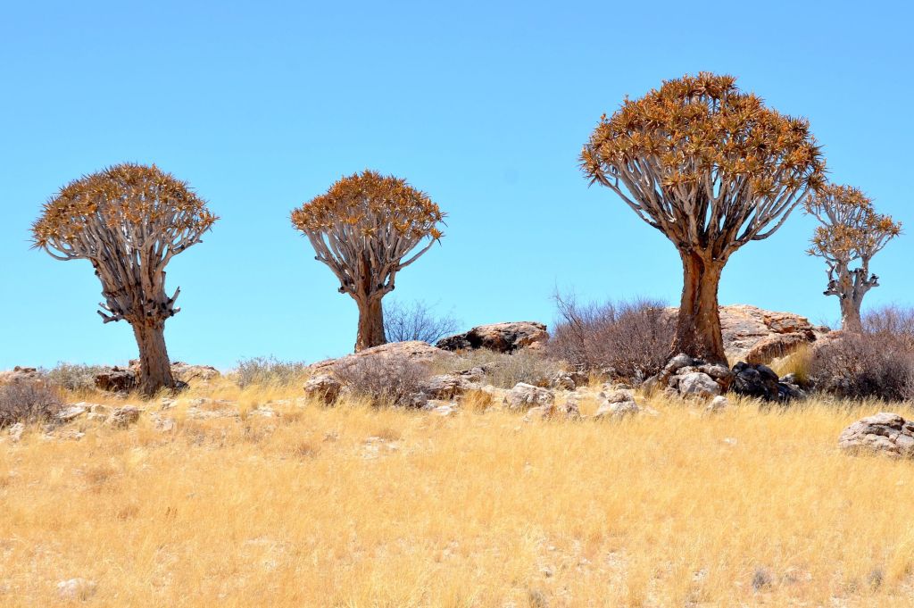 Entre las plantas más notables se encuentra el árbol carcaj, llamado así por los bosquimanos que utilizan sus ramas huecas para crear fundas de flechas. A pesar de su forma arbórea, con alturas que pueden alcanzar los 18 metros, guarda una estrecha relación con el áloe vera. Comparte adaptaciones similares, como hojas gruesas, crasas, de superficie cerosa, un metabolismo ácido que le permite extraer agua del suelo solo durante la noche, y raíces muy profundas capaces de acceder al agua subterránea.