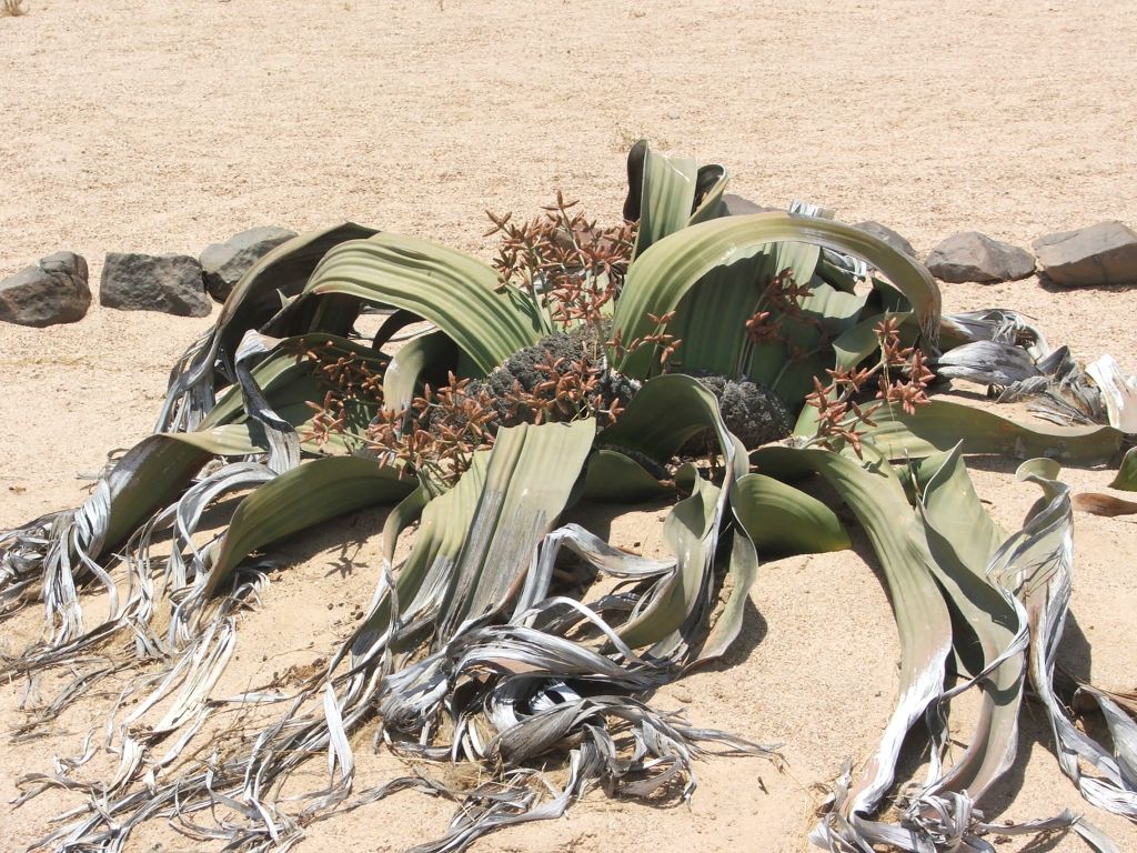 Probablemente, la planta más impresionante del desierto de Namib sea la emblemática Welwitschia mirabilis, endémica de la región y símbolo nacional de Namibia. Esta planta desafía las extremas condiciones de aridez, las temperaturas severas y las escasas precipitaciones gracias a su morfología única y a sus adaptaciones especializadas. Con un tallo robusto que puede alcanzar el metro y medio de altura y dos hojas perennes que se extienden más de ocho metros, Welwitschia ha desarrollado la capacidad de capturar la humedad de las nieblas, similar a ciertos insectos adaptados al desierto.