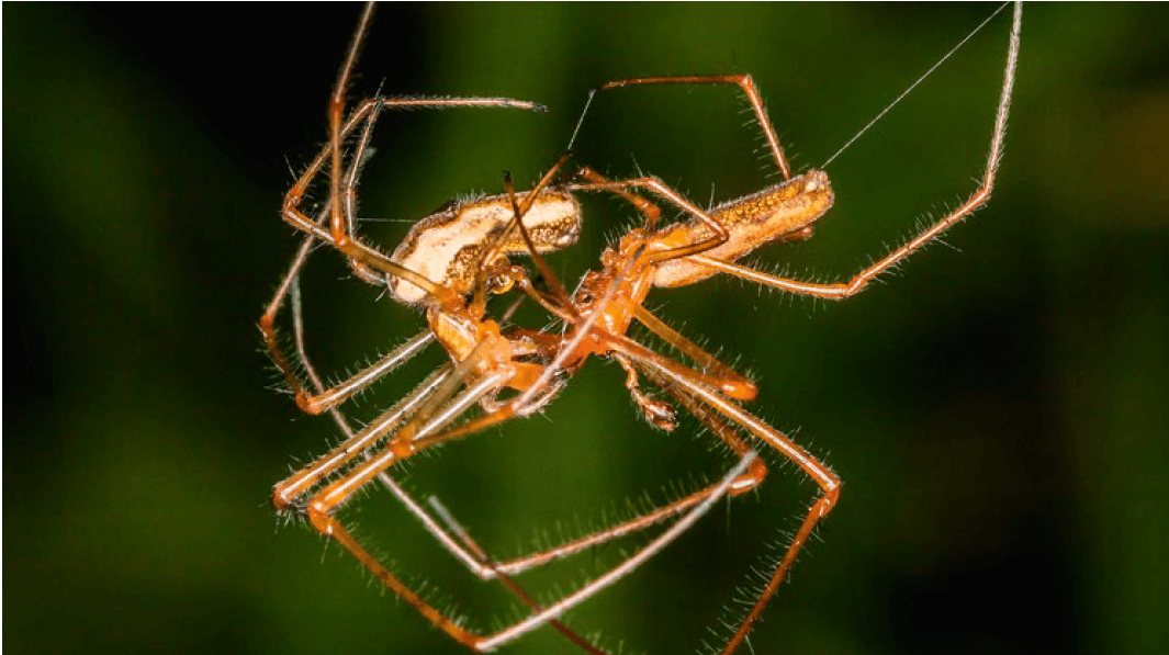 El canibalismo visto como una estrategia de supervivencia de ciertas especies lo podemos observar perfectamente en muchos géneros de arañas, donde la hembra, normalmente de tamaño mucho mayor que el macho, puede devorarlo tras la cópula para así obtener energía y nutrientes que necesitará para sacar adelante a su futura prole. En torno a esta lucha por la supervivencia, los machos han entrado en una guerra armamentística evolutiva, haciéndose con estrategias de distracción, entretenimiento y sigilo, para poder fecundar a la hembra y escapar sanos y salvos, prácticamente sin que esta se dé cuenta. Entre ellas está la curiosa técnica de envolver un insecto en una gran cantidad de tela de araña y entregárselo como ofrenda a la hembra, para llevar a cabo una cópula fugaz mientras esta se entretiene «desenvolviendo» el inteligente regalo. También hay casos de machos que «atan» a las hembras, dando lugar a un curioso «bondage arácnido».