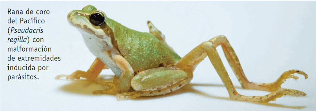 Una de las condiciones más reconocibles en los zombis de ficción es su aspecto físico, putrefacto y deforme. La descomposición de la carne, la falta de partes del cuerpo y de extremidades, o la falta de sensibilidad en la totalidad del cuerpo del zombi son parte de la leyenda en torno a estos cadáveres vueltos a la vida que hemos integrado en nuestra cultura popular. No es exactamente lo mismo, pero lo que hace el gusano platelminto Ribeiroia ondatrae, a anfibios como las ranas toro, puede ser parecido. El gusano se reproduce asexualmente dentro de un caracol, pero estas larvas salen del primer huésped en busca de un segundo, los renacuajos de rana toro, a los que perforan la piel para enquistarse en sus extremidades en desarrollo. Esto tiene como consecuencia que las ranas que surgen a partir de estos renacuajos, desarrollen patas supernumerarias, ausentes o terribles malformaciones. De esta manera, con aspecto de zombi contrahecho, la víctima se vuelve ahora presa fácil para las aves comedoras de ranas, como las garzas. En el interior del ave, el parásito puede reproducirse sexualmente, volviendo sus huevos al agua, junto con las heces del pájaro. De este modo, las nuevas larvas pueden introducirse en caracoles, iniciando de nuevo el ciclo.