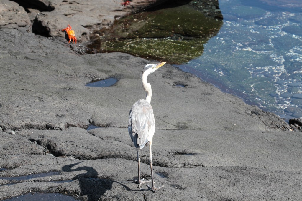 La garza de lava es un ave que anida alrededor de las costas de rocas de lava en Galápagos. Durante la temporada de reproducción, sus patas cambian de color de un gris oscuro a un naranja brillante. Se pueden ver durante todo el año y es magnífico verlas en acción, pues son veloces como el rayo en comparación con otros animales de las Galápagos. Pueden atrapar cangrejos a un ritmo de 2-3 por minuto. Son unos cazadores impresionantes.