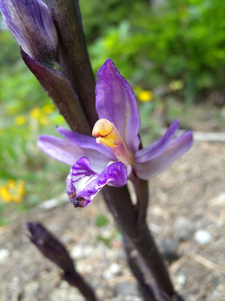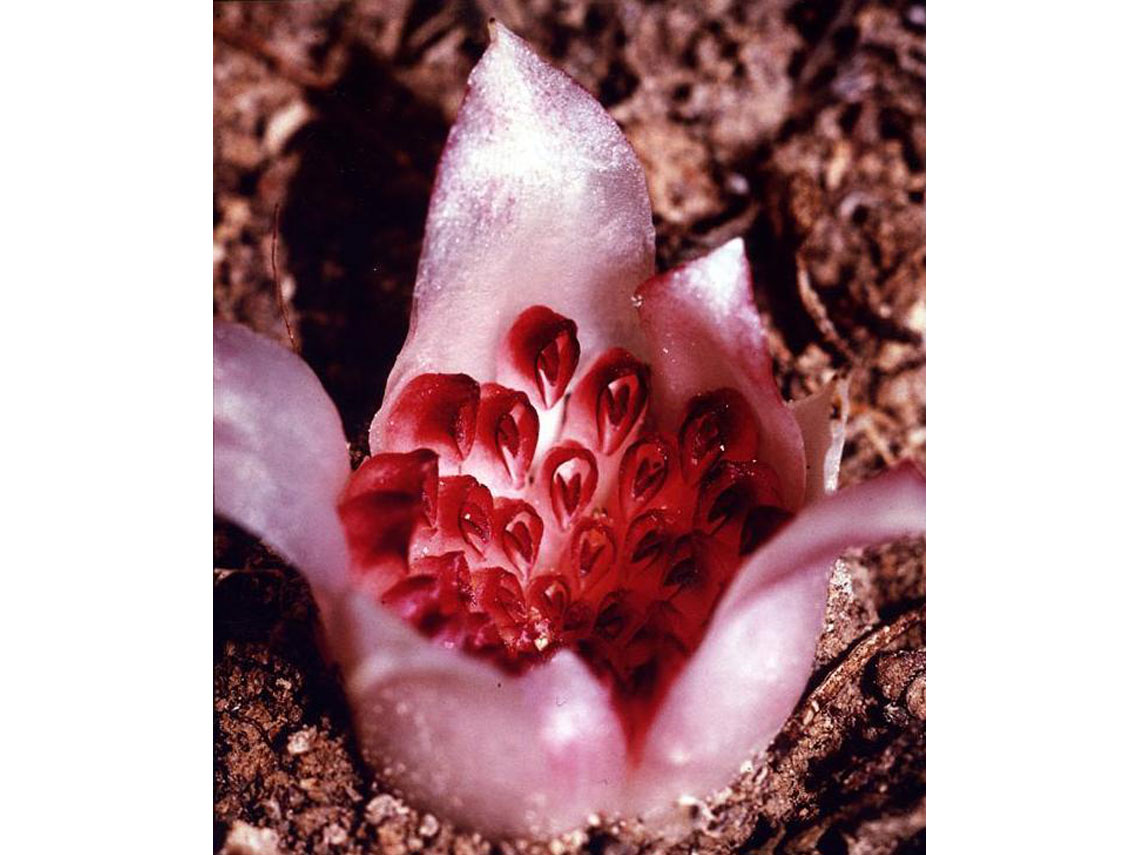 Esta rara orquídea carece de clorofila y obtiene su energía aprovechando la materia orgánica en descomposición del suelo con la ayuda de micorrizas.