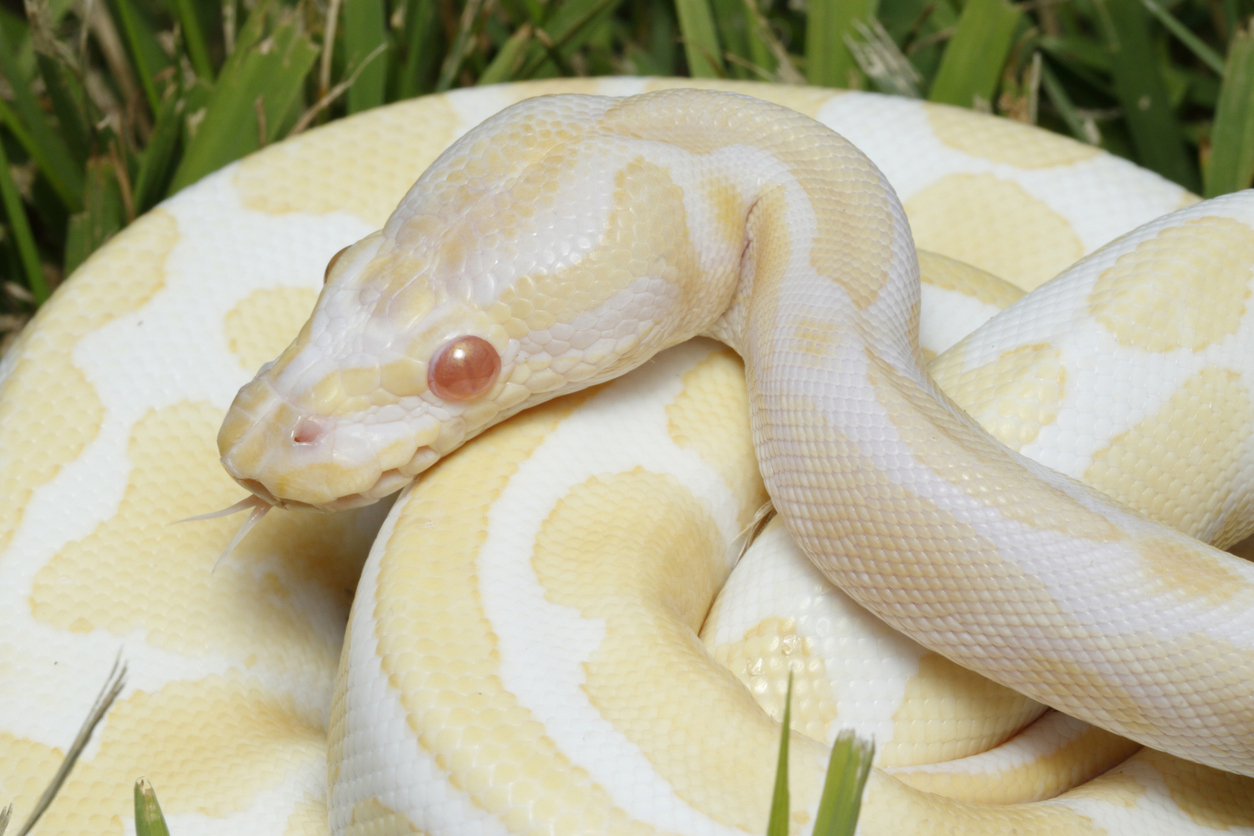 Las pitones albinas suelen presentar un color amarillo claro en su piel, si bien algunas pueden ser totalmente blancas o rosadas.