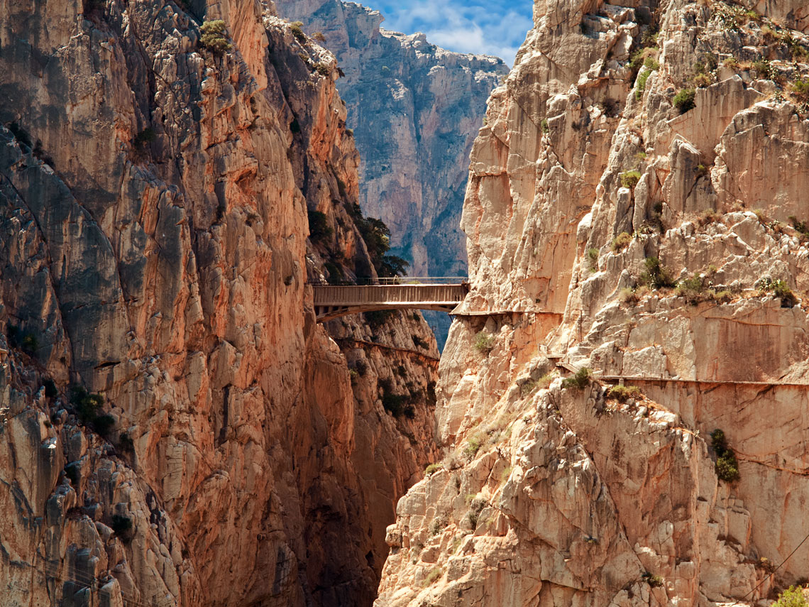 En el desfiladero de los Gaitanes (Málaga), se encuentra esta pasarela peatonal de más de tres kilómetros, adosada a la roca en el interior de un cañón, con tramos de una anchura de apenas un metro, colgando hasta 105 metros de altura sobre el río, en unas paredes casi verticales.