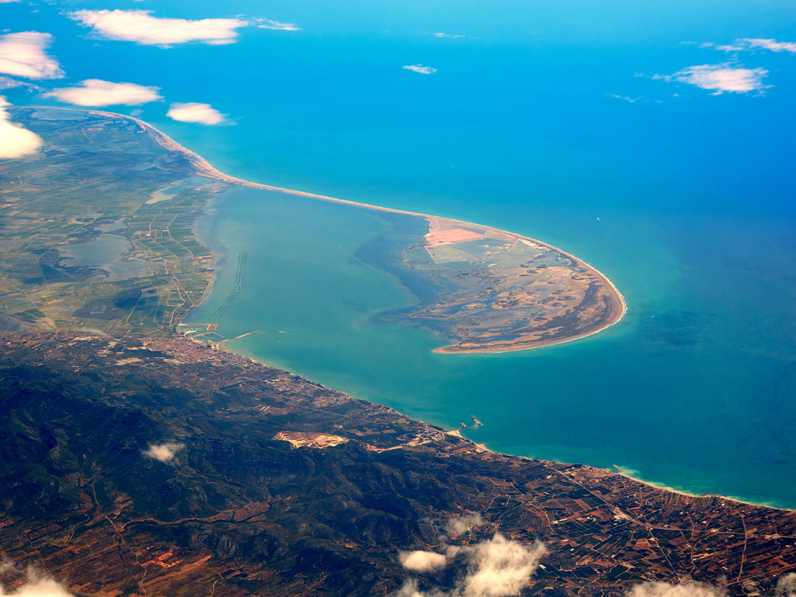 Este paisaje de gran riqueza biológica se sitúa en la desembocadura del río Ebro en el Mediterráneo.