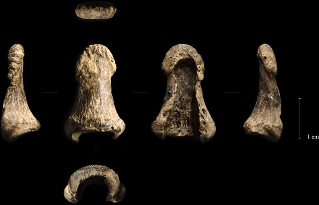 Lo más sorprendente es que este objeto no fue hallado de forma aislada. Junto al bumerán apareció una falange distal izquierda humana, un diente tallado y colgantes hechos con caninos de zorro ártico. Los autores interpretan este conjunto como un posible depósito ritual. El análisis morfológico y genético confirmó que el hueso humano pertenecía a Homo sapiens, y los análisis isotópicos indican que se alimentaba de alimentos terrestres y posiblemente pescado de agua dulce, según sus niveles de nitrógeno y azufre.