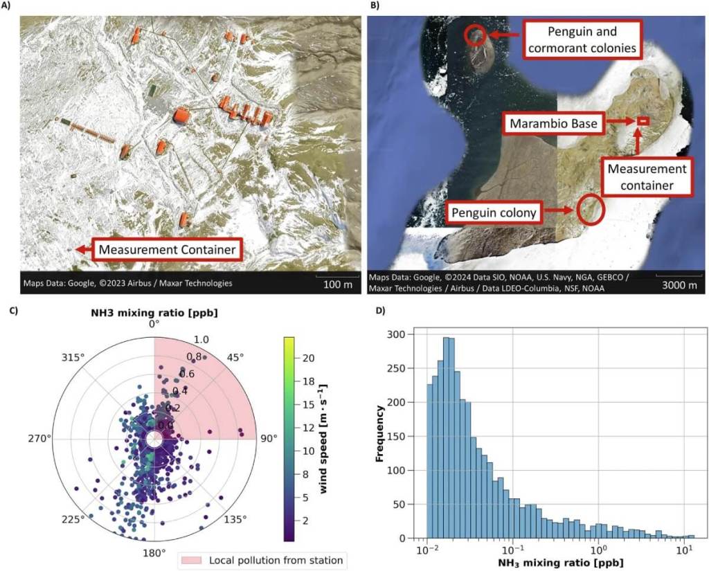 En el verano de 2023, un equipo de investigación se instaló en la Base Marambio, en la isla Seymour, un punto estratégico por su proximidad a varias colonias de pingüinos Adelia. Allí, con instrumentos de alta precisión, comenzaron a registrar concentraciones de amoníaco en el aire que, en algunos momentos, alcanzaron hasta 13,5 partes por mil millones, unas mil veces por encima del nivel habitual.