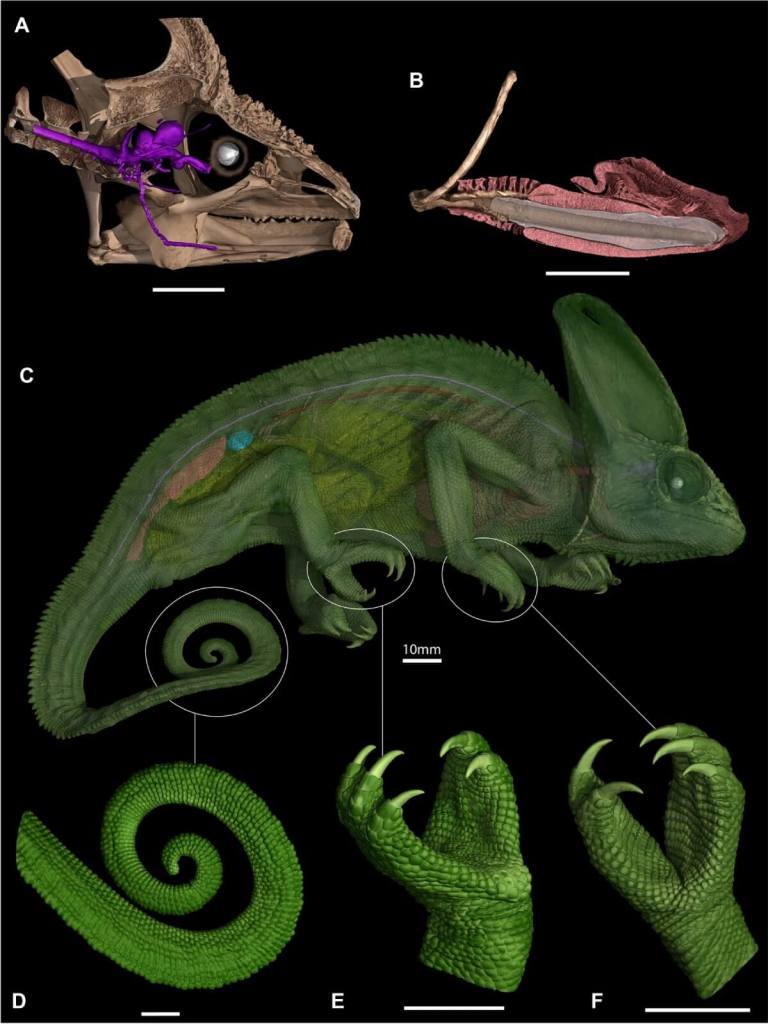 Esto fue posible gracias al uso de escáneres de tomografía computarizada con contraste, una técnica que permite observar tejidos blandos sin necesidad de diseccionar. La investigación se basó en el análisis de 34 especies de reptiles escamosos, entre ellos tres especies de camaleones muy distintas en tamaño y hábitat. Los autores describen que, en todos los camaleones analizados, los nervios que conectan los ojos con el cerebro recorren un camino enrevesado, lleno de vueltas y ángulos de 90 grados, en lugar de seguir una línea recta como en la mayoría de los vertebrados.
