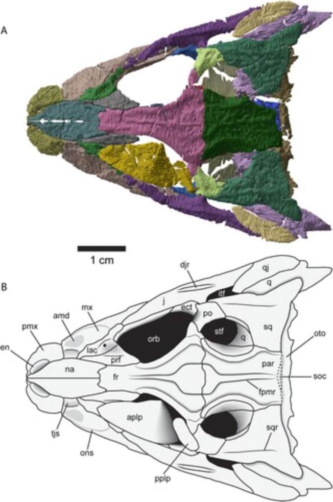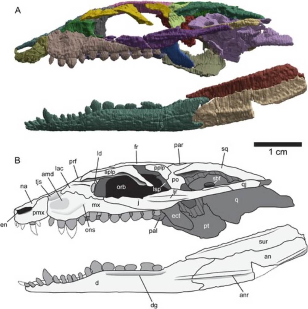 La mayoría de los cocodrilos actuales son animales acuáticos, de gran tamaño y con dientes cónicos diseñados para atrapar presas en el agua. Sin embargo, “Elton” no encaja en ese molde evolutivo. Los investigadores lo describen como un animal completamente terrestre, con características dentales que sugieren una dieta variada. El cráneo, de apenas 50 milímetros, presenta una dentición heterodonta: es decir, con distintos tipos de dientes, algo inusual entre los cocodrilos.