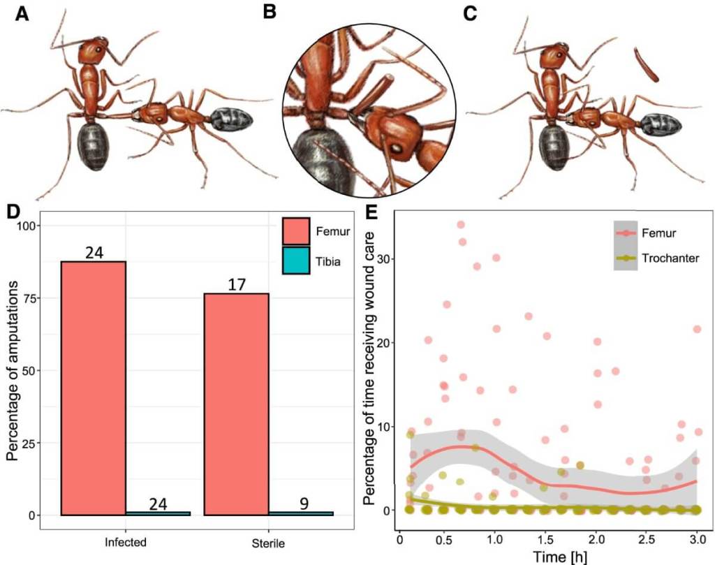 La precisión y cooperación que muestran en este proceso es llamativa. La hormiga herida suele quedarse quieta, permitiendo que su compañera muerda y retire la pata sin ofrecer resistencia. Tras la amputación, otra hormiga limpia cuidadosamente la nueva herida. El estudio lo describe así: “Los compañeros de nido comenzaron lamiendo la herida antes de moverse por la extremidad lesionada con sus piezas bucales hasta alcanzar el trocánter”.
