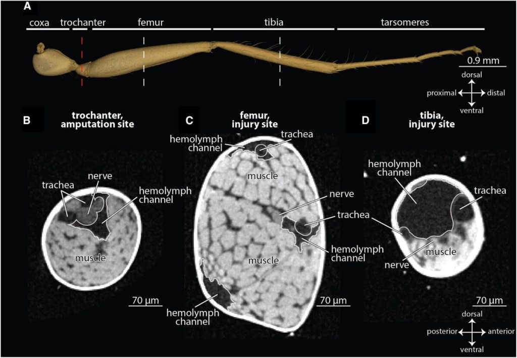 La razón está en cómo circula la hemolinfa (el equivalente a la sangre en insectos) dentro de sus patas. Según comprobaron los investigadores con escáneres y reconstrucciones 3D, el fémur contiene la mayor parte de la musculatura que impulsa la hemolinfa, mientras que la tibia tiene menos músculo y un canal más grande por donde se mueven los fluidos. Por tanto, una herida en la tibia permite que los patógenos se expandan mucho más rápido, lo que hace que amputar no sirva de nada si ya se ha producido la infección.