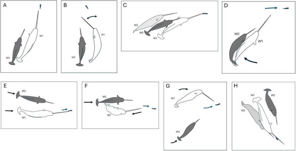 En una de las observaciones más detalladas, tres narvales persiguieron a un pez durante varios minutos, ajustando sus movimientos para mantenerlo a la vista del colmillo. Uno de ellos lo golpeó varias veces con la punta y el lateral del colmillo. A pesar de la intensidad de la persecución, no hubo intento claro de consumir al pez, lo que sugiere una posible función lúdica o de entrenamiento.