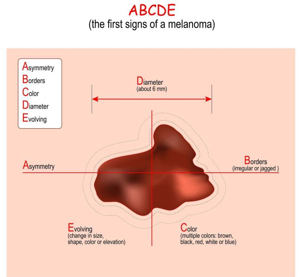 El melanoma se presenta visualmente en forma de lunares irregulares que exponen una alteración en la asimetría, bordes, color, diámetro, evolución e incluso puede producir dolor o molestia al tacto con los dedos.