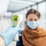 Hombre tomándole la temperatura a una mujer con mascarilla