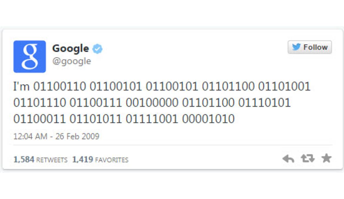 El primer e histórico tuit de Google fue "Me siento afortunado", 'I`m feeling lucky' (en inglés), puesto en código binario. Fue en febrero de 2009. Incluso estas palabras exactas se incluyeron más tarde en el formato de botón en la página de inicio del buscador Google. Hoy día el botón 'Voy a tener suerte' nos dirige automáticamente al primer resultado de la búsqueda.