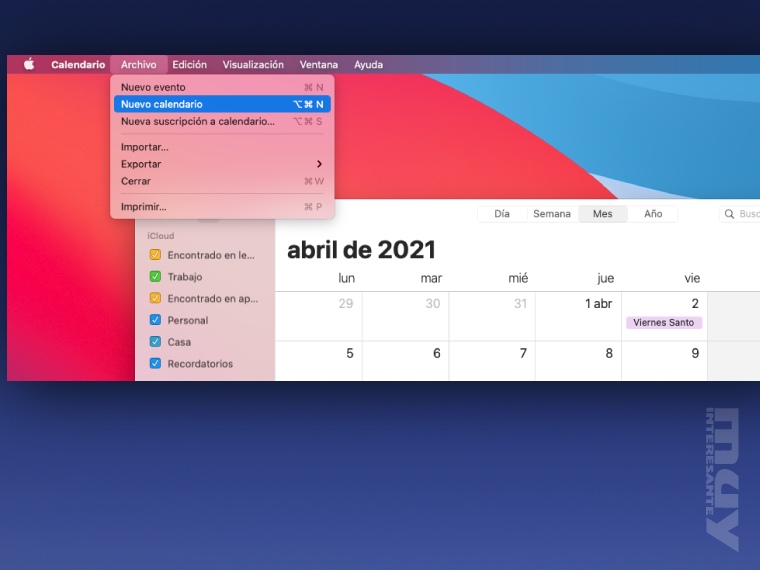En macOS el proceso es un poco diferente. Solo necesitamos abrir la aplicación Calendario, que posiblemente encontrarás en el Dock, y seguidamente pulsar en Archivo (que encontrarás ubicado en la barra de menú que aparece en la parte superior de la pantalla) y Nuevo calendario.