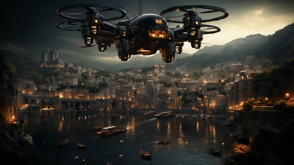 Los drones son tan habituales como las propias personas y proporcionan tanto una vista aérea para los viajeros como un sistema rápido de entrega de mercancías, lo que reduce la necesidad de transporte a nivel del suelo.