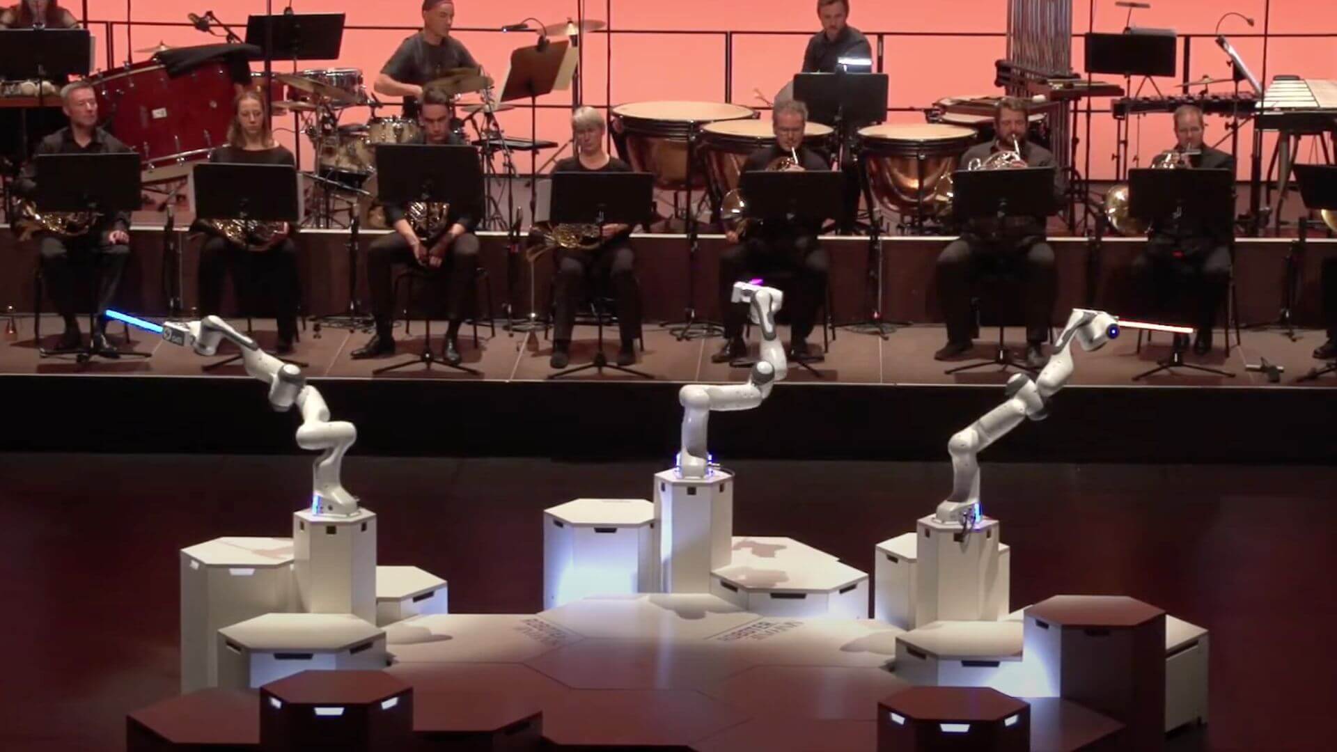 El concierto "Robot Symphony" constó de tres partes: dos dirigidas por la mano humana y una por los tres brazos robóticos. En su turno, el robot MAiRA, equipado con tres brazos, sostiene un trío de barras lumínicas de diferentes colores para señalar el ritmo. Cada sección de la orquesta sigue un color específico, generando así ritmos cruzados y superpuestos. Este sistema permite que el conjunto se divida en tres grupos sincronizados, cada uno respondiendo de manera independiente a su señal de color, lo que crea una interacción rítmica única y compleja en la interpretación. Un espectáculo no solo musical sino también visual, que recuerda a los ritmos de las películas de ciencia ficción.