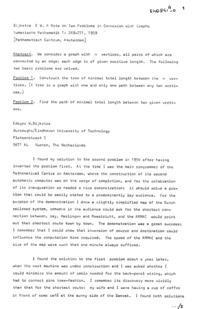 - Dijkstra, E. W. (1959). A note on two problems in connexion with graphs. Numerische Mathematik 1: 269-271. S2CID 123284777. doi:10.1007/BF01386390.