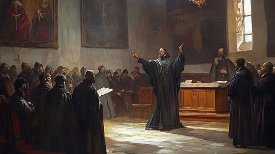 Recreación artística de un taller medieval donde un artesano imprime la imagen de la Sábana Santa sobre un lienzo usando un relieve, técnica que los estudios modernos proponen como origen del famoso sudario